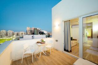 The Penthouse showcases an eagle eye view of the vibrant sea side town with views of the Mediterranean sea, Fort Tigne and the majestic Valletta skyline. Equipped with a lovely sun soaked terrace and sunbeds, it is a top floor haven for those urbanite lovers. Chill out in the sun with your aperativo and catch that salty sea breeze from Tigne Point. Have breakfast out on the 360°terrace equipped with an outdoor table for two.